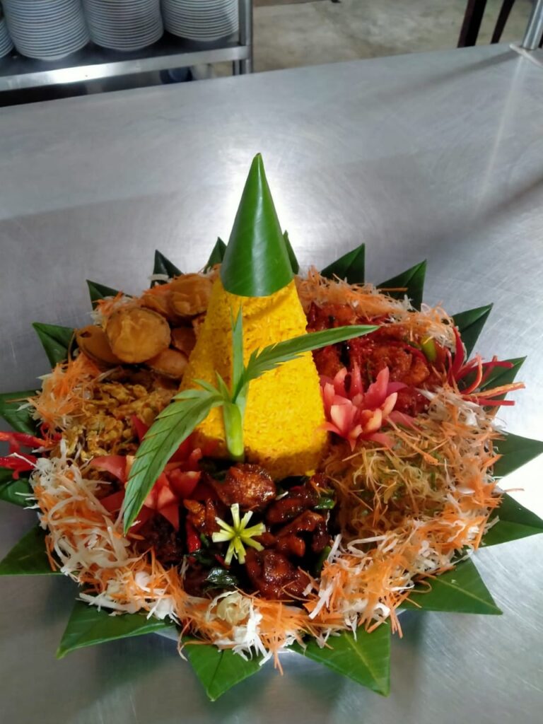 Hidangan khas Nusantara dengan nasi kuning berbentuk kerucut, disajikan bersama lauk pauk pilihan seperti ayam goreng, sambal, telur, dan sayur urap. Cocok untuk acara spesial dan perayaan.