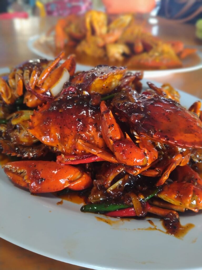 Kepiting segar berpadu dengan saus lada hitam yang hangat dan gurih, menciptakan sensasi rasa pedas aromatik yang khas dan menggigit.