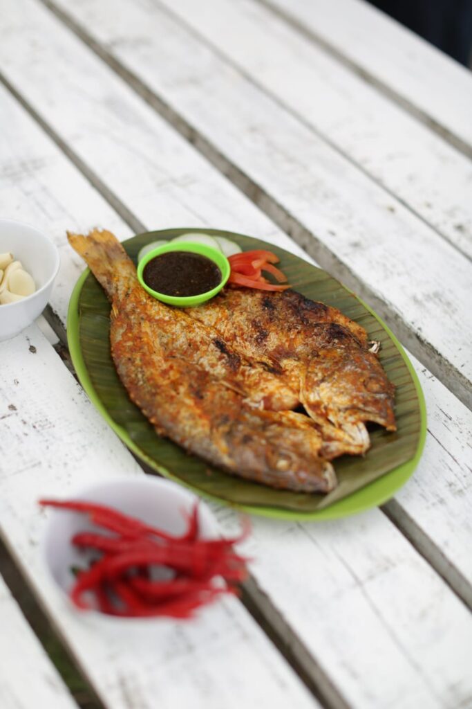 Ikan kakap segar dibakar sempurna dengan bumbu rempah khas, menghasilkan rasa gurih dan aroma asap yang menggoda. Nikmat disantap dengan sambal dan lalapan segar.